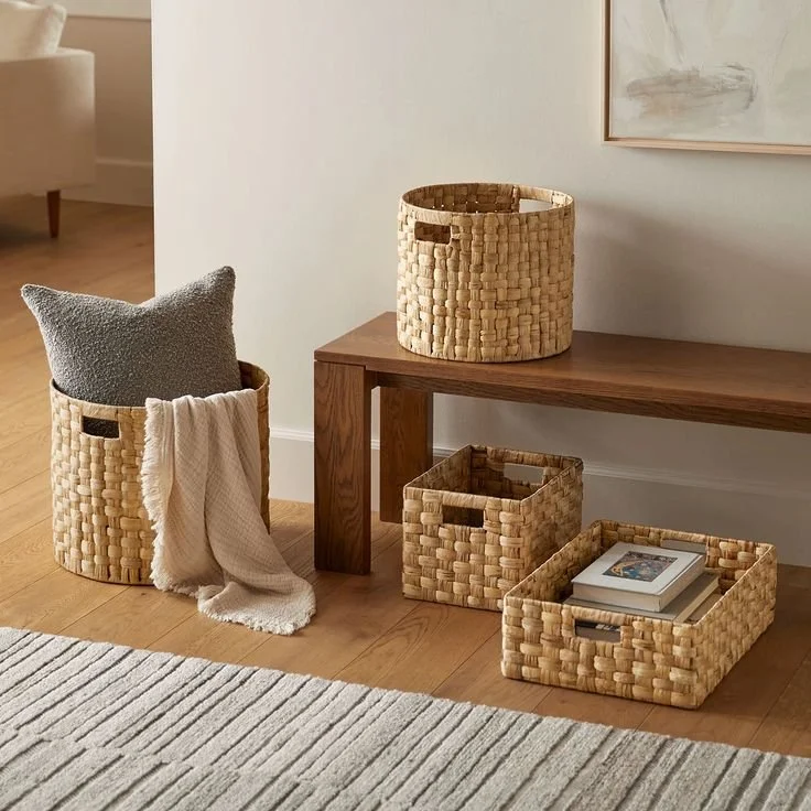 Smaller baskets work well on shelves or console tables, especially when there are a few grouped together. They can hold everyday items like books, throws, or small accessories while keeping the surface from feeling cluttered. The mix of sizes, like the ones shown here, helps break up straight lines and adds a bit of variation.
