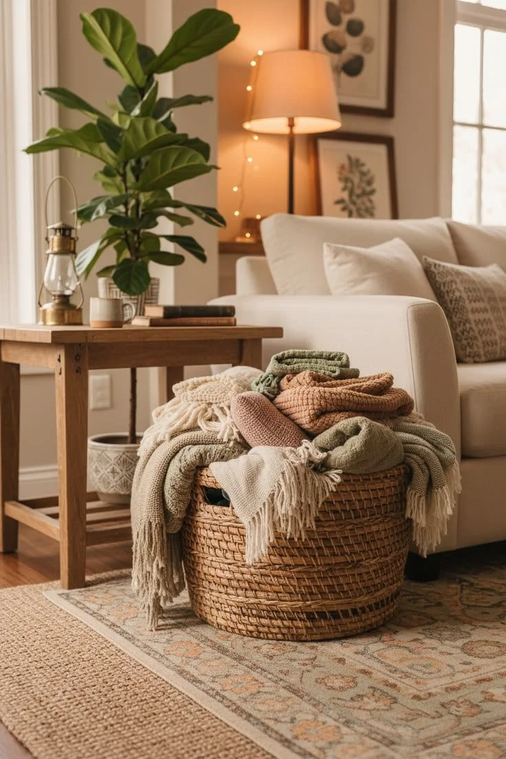 A basket filled with throws works best when it sits right next to where it’s needed. Placed beside a sofa or armchair, it keeps blankets within easy reach without needing to fold and store them elsewhere. It also adds a softer layer to the room, especially when the fabrics vary in texture and colour.