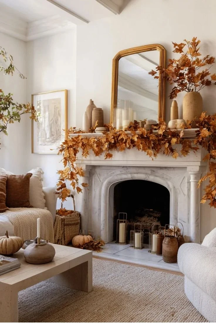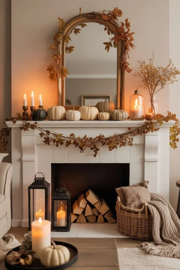 A mantel doesn’t need to be filled edge to edge. What makes it feel balanced is how the heights are arranged. Taller pieces like mirrors, branches, or vases create structure, while lower items like pumpkins or candles keep it grounded.