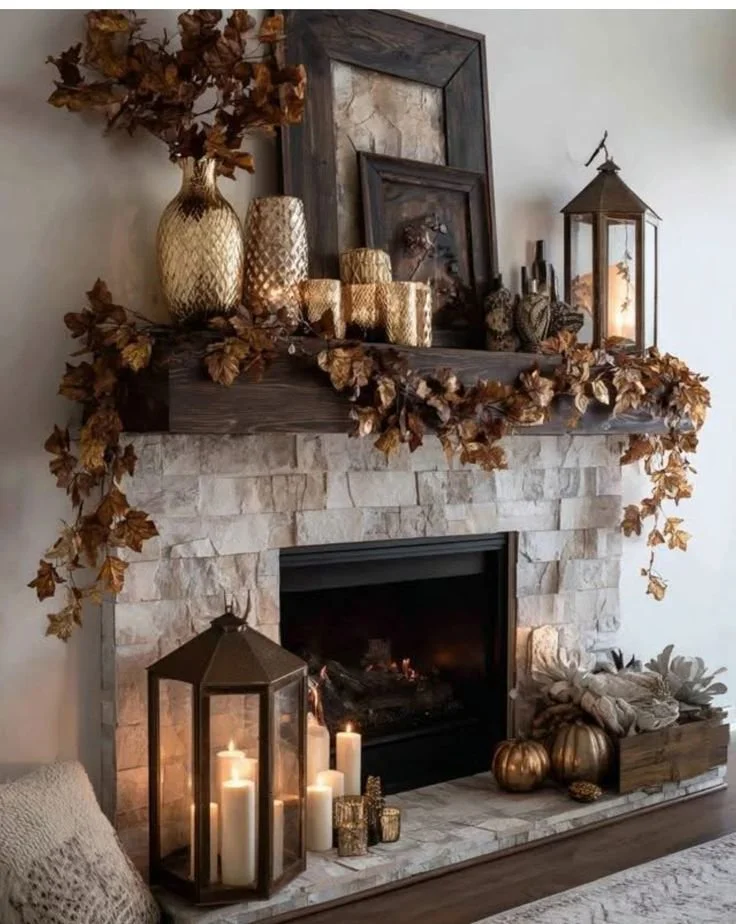 Lighting tends to shift the feel of a mantel more than the decor itself. In this setup, candles and lanterns do most of the work. The glow softens the harder materials like stone or wood and pulls everything together, especially in the evening.