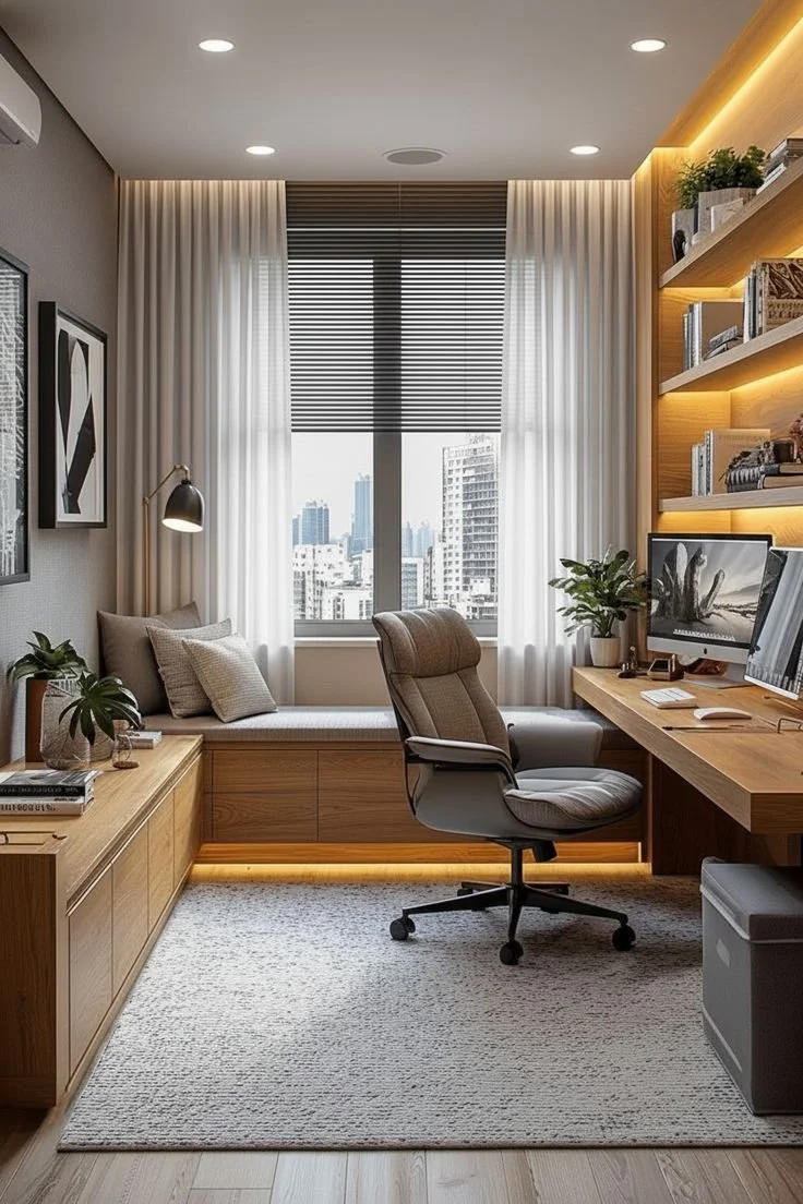 For the final upgrade, add one built-in element: wall-to-wall shelving, a desk return, or lower cabinetry with open shelves above. That single move signals bespoke interior design Los Angeles and makes the room feel designed, not pieced together.
