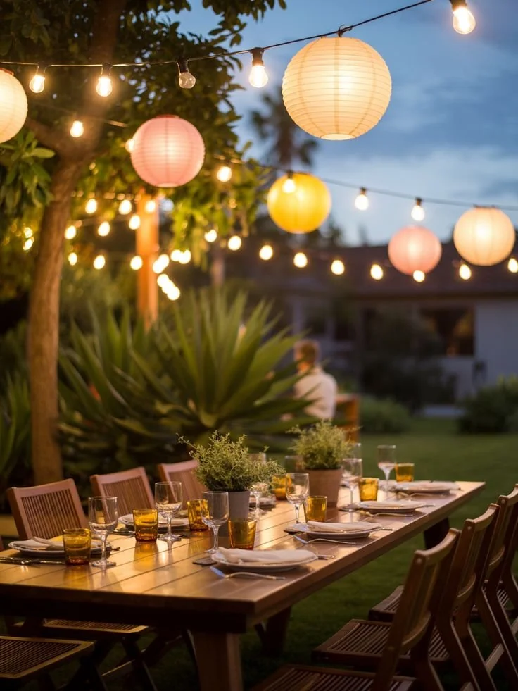 As the afternoon turns into evening, lighting starts to shape the atmosphere of the gathering. String lights hung between trees or across the patio are often enough to keep the space comfortable after sunset. Paper lanterns or small table candles add another layer of light without making the setup feel overly planned.