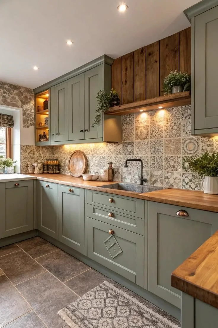 Here, the soft green cabinets bring in just enough color without taking over. Paired with wood countertops and a slightly textured backsplash, the room feels more settled. It’s still simple, but there’s more to look at, and it doesn’t rely on contrast alone to hold the space together.