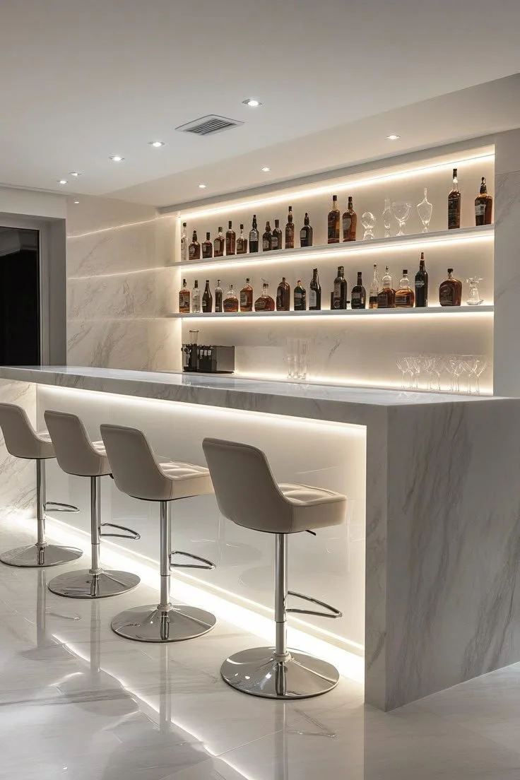 The layout also encourages people to gather without blocking circulation. With seating at the counter and everything within reach, the space works on its own without relying on the kitchen. This kind of setup is often included in custom home interiors Los Angeles, where secondary areas are designed to support hosting without interrupting the main spaces.