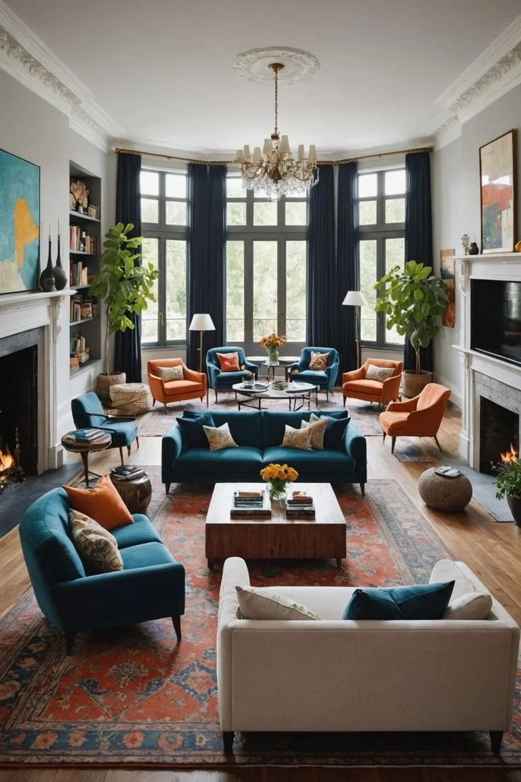 A living area used for hosting shouldn’t feel fixed. This kind of setup works because the seating isn’t locked into one arrangement. Multiple chairs and smaller sofas can be moved or slightly repositioned, making it easier to adjust once guests start arriving.