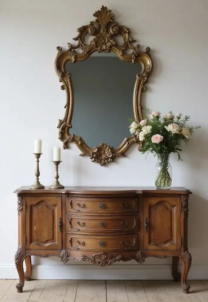 Instead of filling a room with vintage items, a single antique piece can often carry more presence. A carved cabinet, an antique mirror, or a vintage table can easily become the anchor of the room.