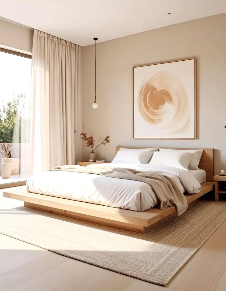 Large windows are left mostly unobstructed, with sheer linen panels that soften glare instead of blocking it. Pale wood framing and natural fiber rugs help diffuse the sunlight rather than reflect it harshly. Even the furniture stays low and simple, so nothing interrupts the flow from outside to inside.