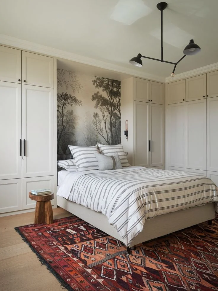Storage works best when it’s built into the room rather than added later. Floor-to-ceiling cabinetry like this keeps everything tucked away, so the space still feels calm even when it’s fully in use. It also removes the need for extra furniture, which helps smaller guest rooms feel more open.