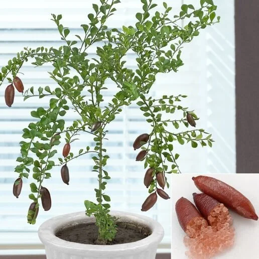 Finger limes stay smaller, which makes them practical for compact spaces or large planters. The fruit is unusual — narrow and filled with bead-like pulp.